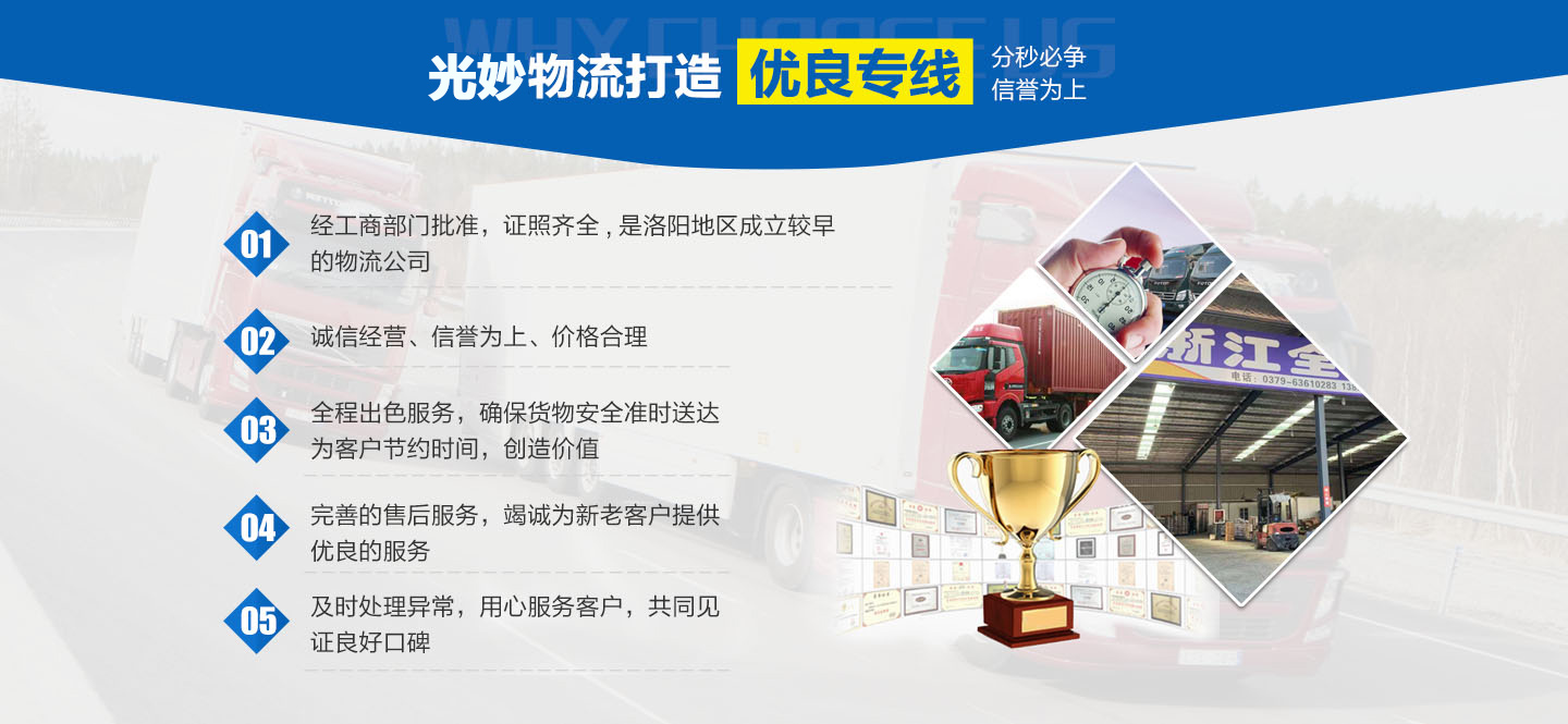 洛陽光妙物流有限公司是洛陽地區(qū)一家經(jīng)工商部門批準(zhǔn)的物流公司。十幾年來秉承誠信經(jīng)營、信譽(yù)為上、價格合理的服務(wù)理念,為廣大客戶提供物流送達(dá)服務(wù)。